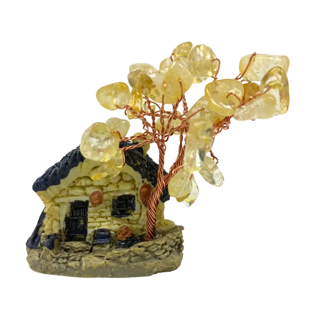 Fairy Cottage with Citrine Tree A tiny house with detailed stone walls and a thatched roof made just for fairies or other tiny creatures. Shaded by a Citrine Gemstone Tree