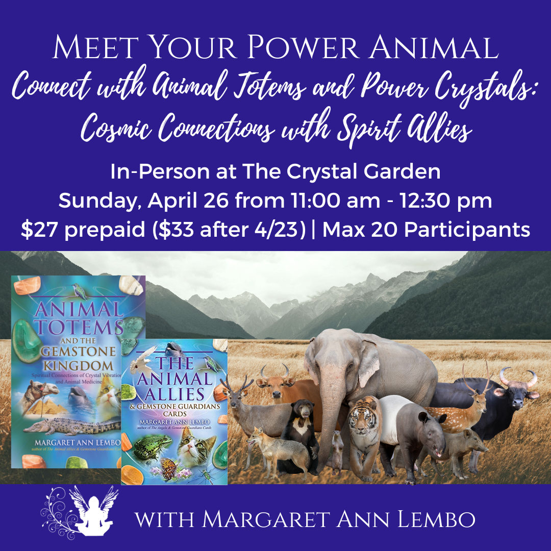 Learn about symbolism, crystals, and spiritual connections for personal fulfillment. Each participant will draw a card from the Animal Allies and Gemstone Guardians Cards to learn about that animal. Experience a guided imagery meditation to meet with a power animal and matching crystal vibration.