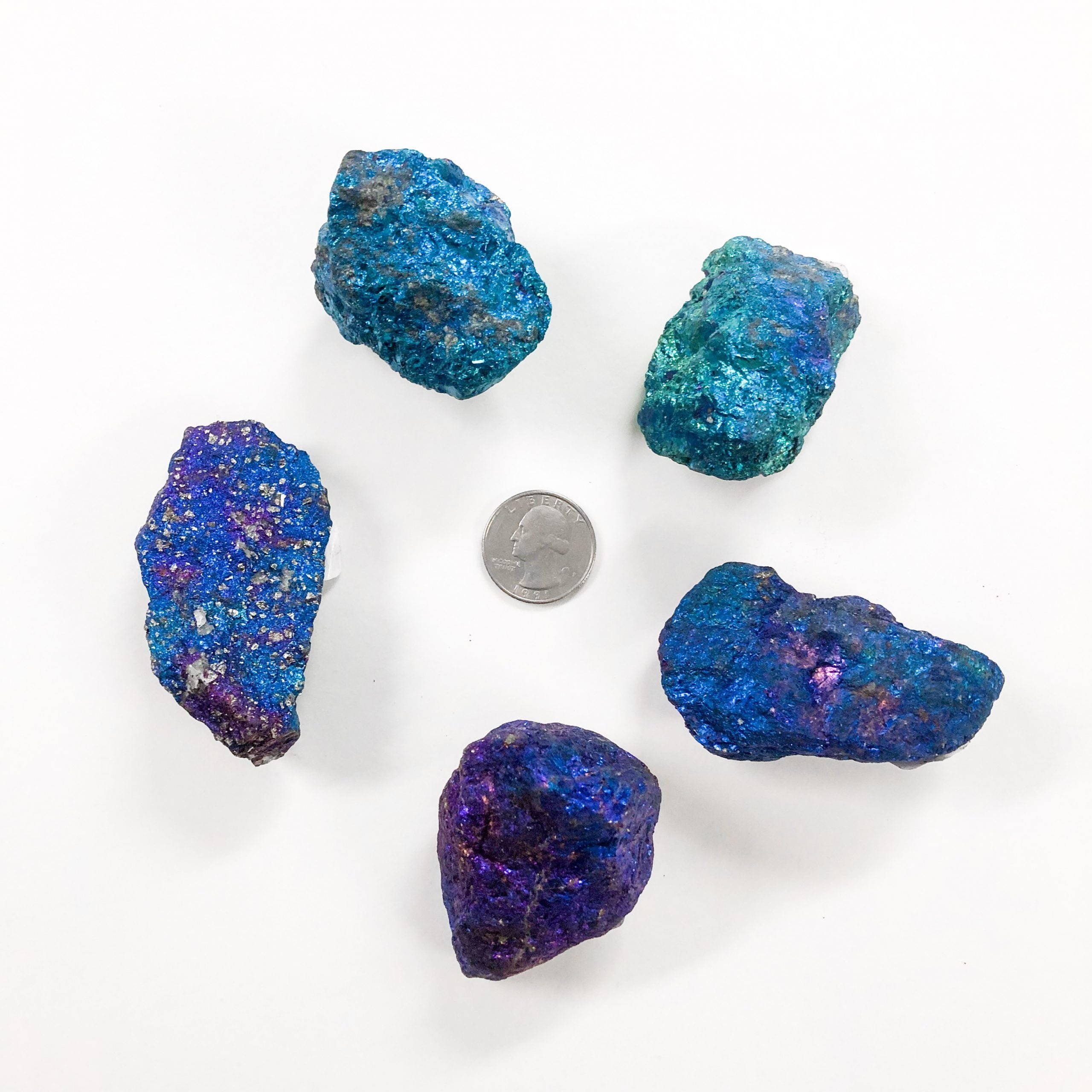 Color: blue, purple, turquoise, copper-red