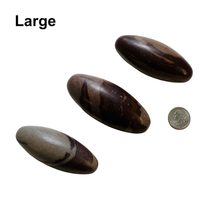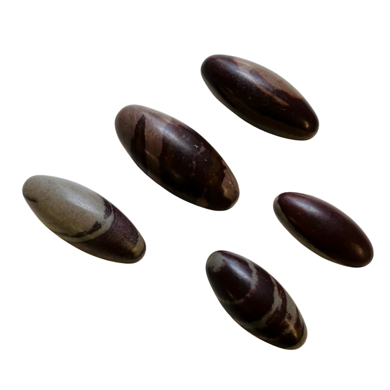 Linghams come only from the Narmada River in India. Accessible only during the dry season, these stones are collected from the river bed by only a few families who have been trained in the way to identify only the most special pieces. They are then shaped and polished to bring out the natural markings. The Lingham shape is representative of the power of Shiva, the Lord of Creation, the masculine creative energy. The markings, also known as the yoni symbolize the feminine energy, the seed which is fertilized to manifest the creative power in the dance of the cosmos.