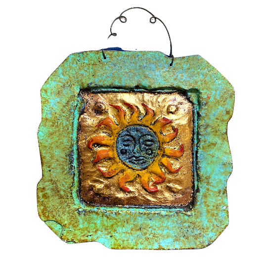 Each design is hand sculpted in our clay studio. Our styling is best described as decorative, early/ancient European on contemporary themes. The finished design is made into a master mold from plaster. The master is then used to make reinforced latex production molds. Every piece is cast by hand using a proprietary blend of hydrocal, plaster, and fortifying agents to produce a piece of art that is both strong and lightweight. The castings are then shaped by hand with angle grinders, files, and sand paper so that each piece has its own unique form.  Once shaped, the casting is then primed with a cold bronze coating before being colored with gold leaf, metal fibers, acid dyes, patinas, and an acid wash. Each piece is painted by hand and due to the natural chemical processes taking place, no one piece is alike. The finished art piece is sealed with a UV and waterproof coating that will preserve the colors and protect it from the elements