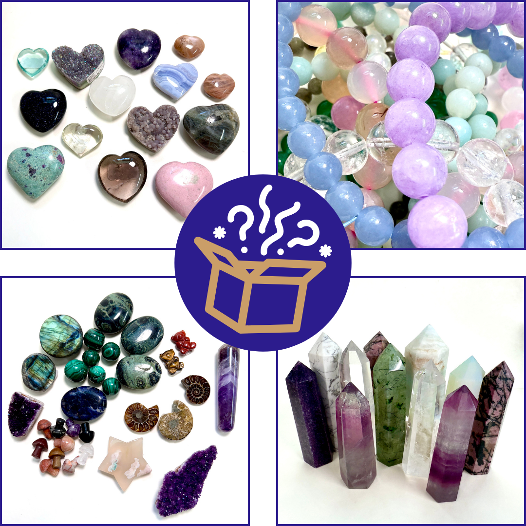 Boxes can include points, obelisks, spheres, hearts, jewelry, tumbled stones, various carvings, or raw crystals.